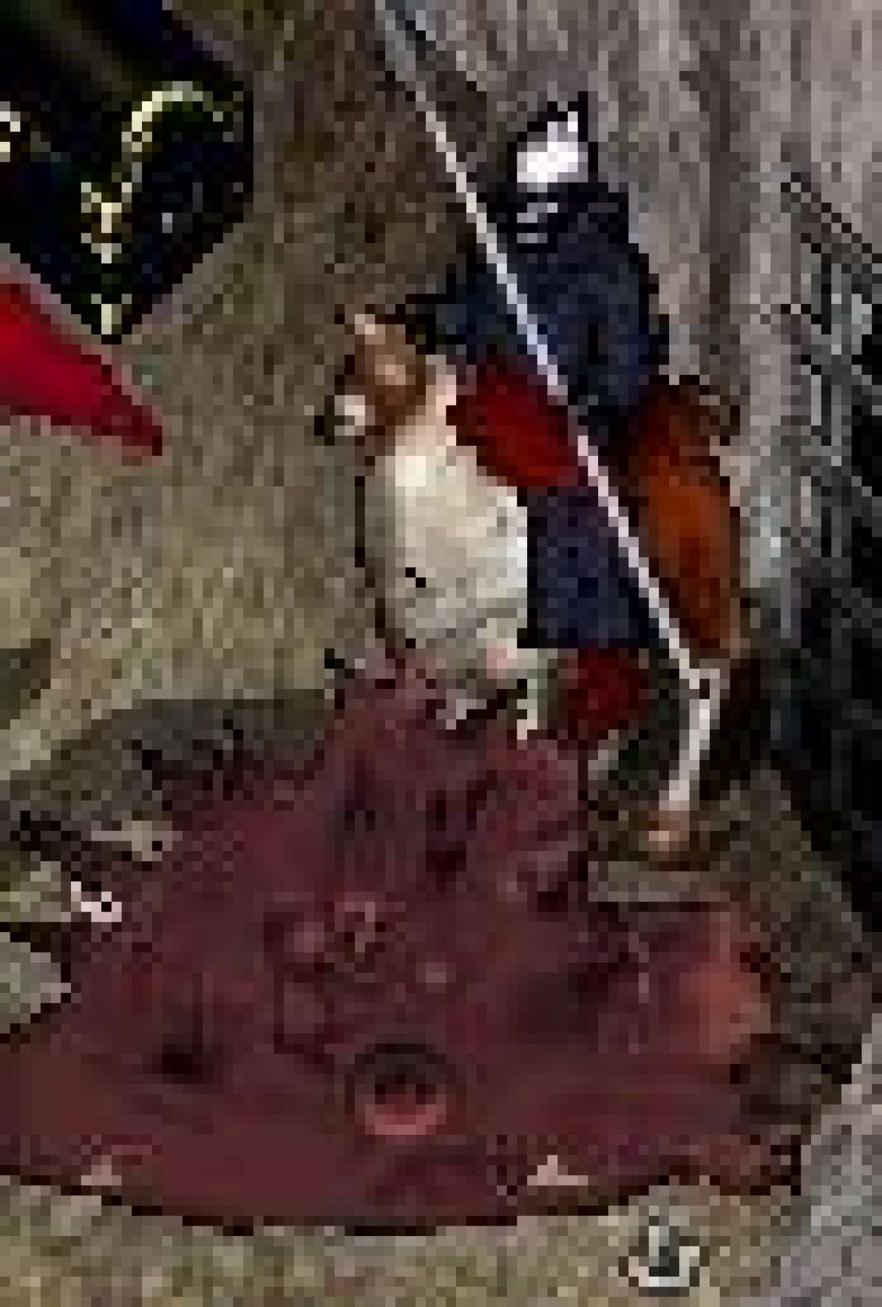Hrdina si nevsiml, ze je v chodbe nizky strop. Uhodil se tak mocne do palice, až upadl z koně a nažral se hliny. |